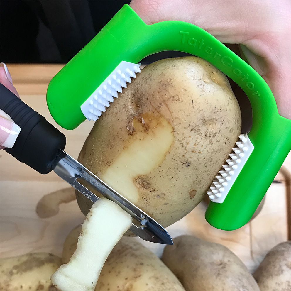 Love using fresh produce like potatoes, cucumbers, mango and squash in your cooking but hate all the issues that come along with peeling them. Well say goodbye to sliced fingers, dropped vegetables and ruined dinners. Introducing the new TaterGator, the worlds first ergonomically designed vegetable gripper.